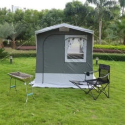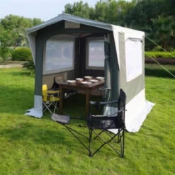 Versatile cucinotto con porta avvolgibile sulla parete anteriore, finestre con profili arrotondati sui tre lati, dotate di zanzariera e coprifinestre incernierati.a. Misura 200×200