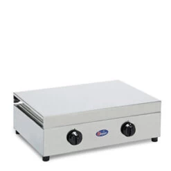 Fornello a gas due fuochi, in acciaio inox, bruciatori in lega Pyral N2, spartifiamma smaltati, griglia smaltata.