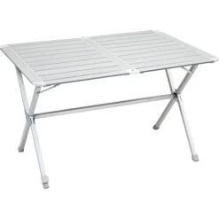Tavolo pieghevole in alluminio con ripiano arrotolabile.