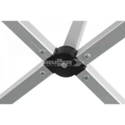 Tavolo in alluminio con ripiano arrotondabile e telaio pieghevole.