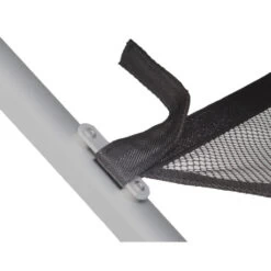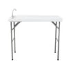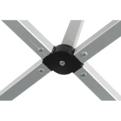Tavolo in alluminio con ripiano arrotondabile e telaio pieghevole.